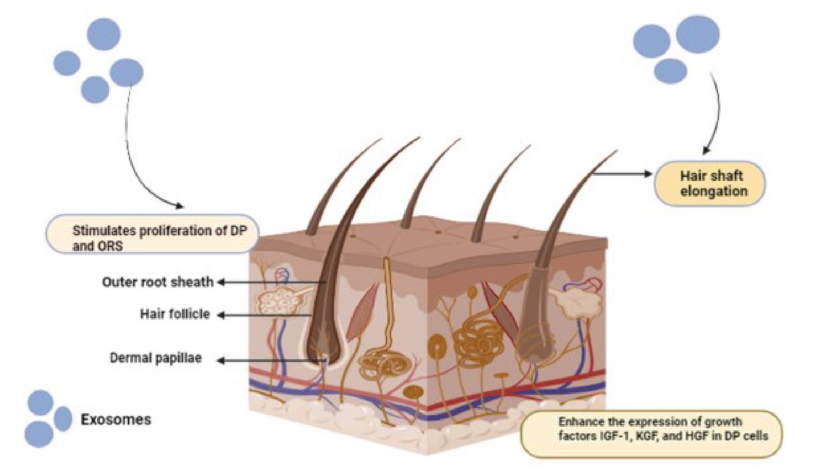 Eksosom melepaskan sinyal dan faktor pertumbuhan yang memengaruhi aktivitas sel epitel terdekat, mendorong pertumbuhan dan pembentukan rambut.
