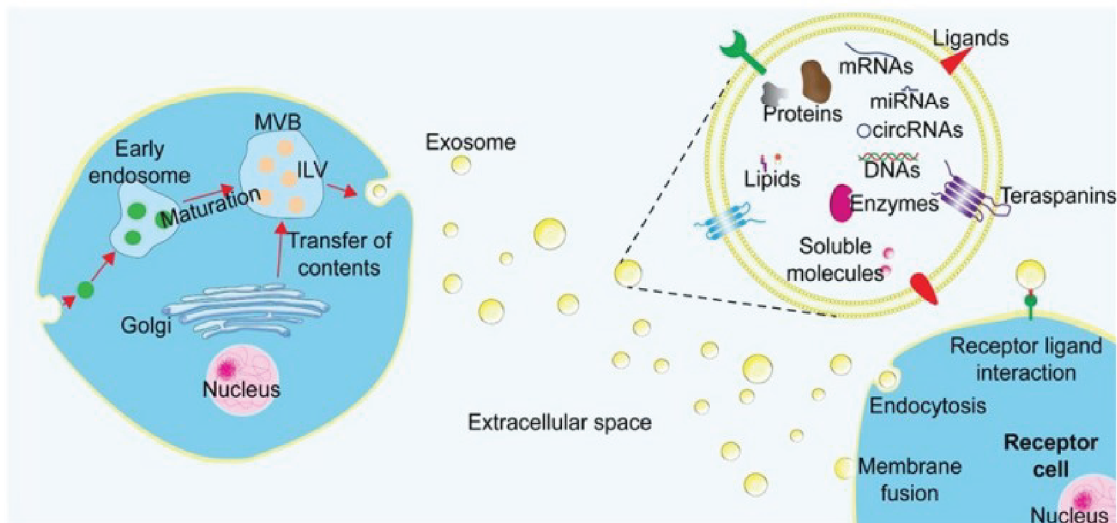Biogenesis eksosom adalah proses biologis yang kompleks dan sangat teregulasi, melibatkan beberapa langkah berurutan. Proses dimulai ketika endosom awal matang menjadi endosom akhir atau badan multivesikular (MVBs). Masuk ke dalam membran endosom MVB menghasilkan Vesikel Intraluminal (ILVs) di dalam lumen organel. Langkah penting berikutnya adalah memutuskan apakah ILVs akan didegradasi oleh lisosom atau diproduksi sebagai eksosom.