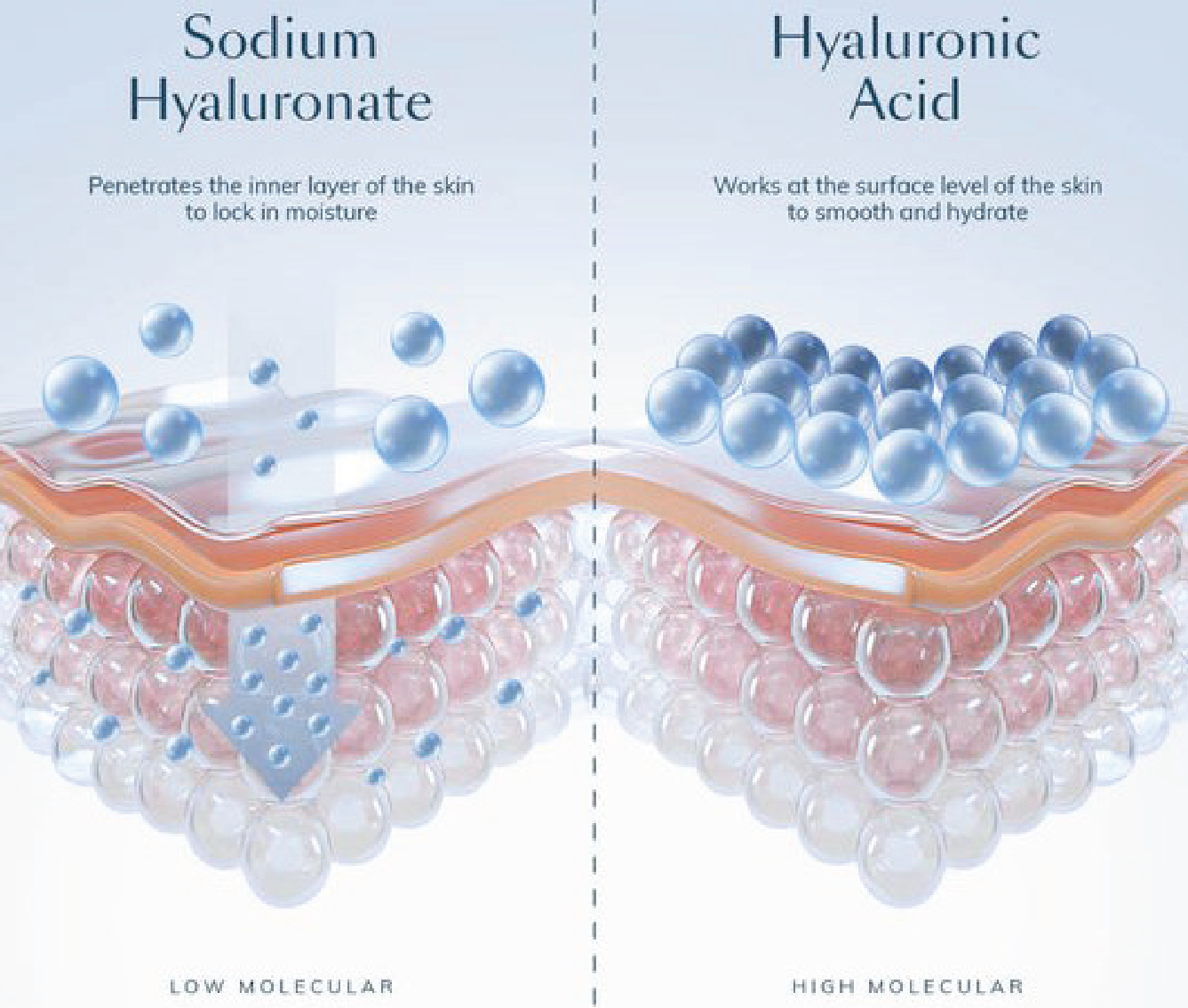 Hyaluronic Acid dan Sodium Hyaluronate adalah bahan aktif yang bekerja sebagai humektan pada kulit. Hyaluronic Acid bekerja dipermukaan kulit dengan menghidrasi kulit sehingga tampak halus dan lembab, sedangkan Sodium hyaluronate bekerja dengan berpenetrasi pada bagian bawah epidermis dan mengunci kelembaban kulit agar tidak mudah menguap pada permukaan kulit.